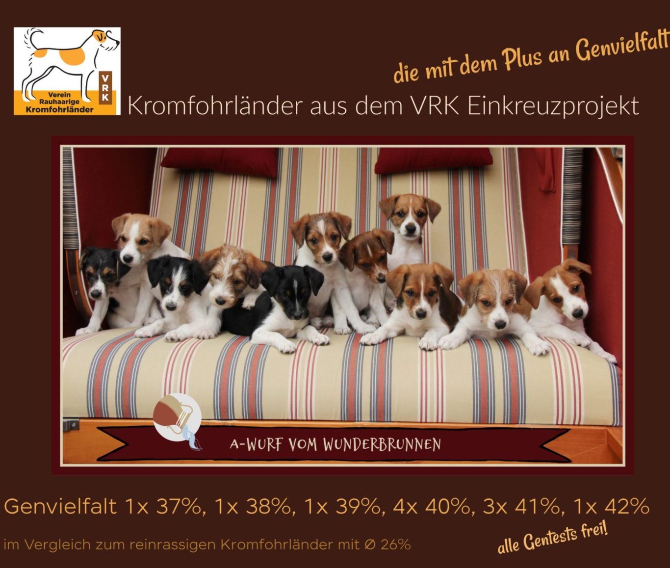 Bei allen Welpen wurden noch bei uns in der Zuchtstätte die Backenabstriche für den MyDog DNA-Test gemacht und die Auswertung hat uns sehr gefreut: Alle elf Hunde sind frei von den 272 zurzeit für den Kromi testbaren Krankheiten! Auch die Werte der genetischen Vielfalt können sich im Vergleich zum Durchschnitts-Rassehund (33%) und reinrassigen Kromfohländer (26%) sehen lassen: 1 x 37%, 1 x 38%, 1 x 39%, 4 x 40%, 3 x 41% und 1x42%! So haben wir das beruhigende Gefühl, dass die 11 Kinder von Janni und Baldo gut gerüstet für ein gesundes Hundeleben sind.